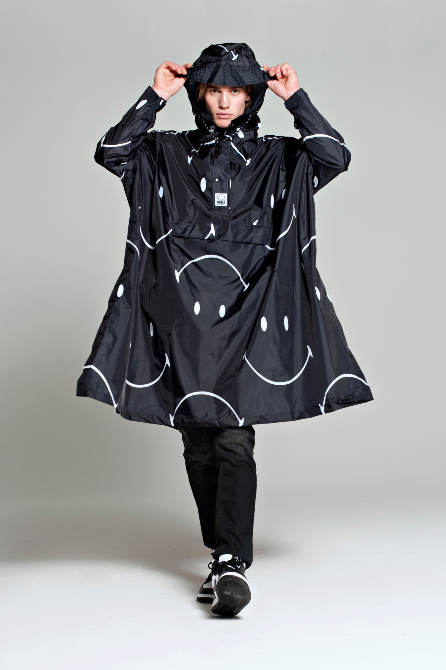 When it rains, just wear a Smiley. The Classic Smile rain poncho combines a playful Smiley Originals icons print with classic two-tone colours to create a minimal poncho that’s guaranteed to keep you dry and smiling. Keep it simple, keep it classic, keep on smiling.